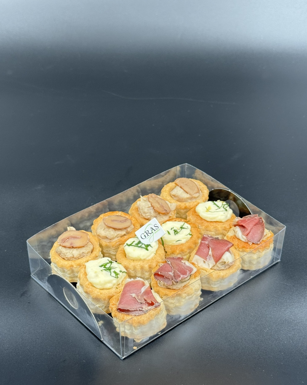 Fait maison. Composé de 12 mini-bouchées garnies : 3 variétés sur le plateau : 4 bouchées brandade/citron vert ; 4 bouchées volaille /châtaigne ; 4 bouchées magret de canard séché/cèpe.