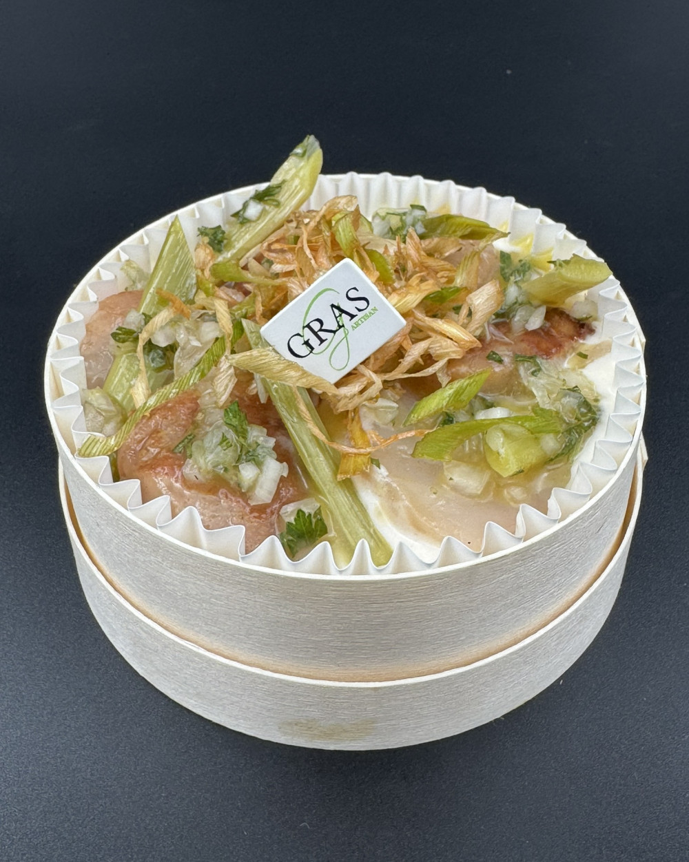 composition : Noix de Saint-Jacques, sauce Champagne, fondue de poireaux, chips de poireaux, mini-poireaux vapeurs. Présentation barquette en  bois recyclable qui se réchauffe au four à 160°C pendant 15 à 20 min. Plat complet pour une personne.